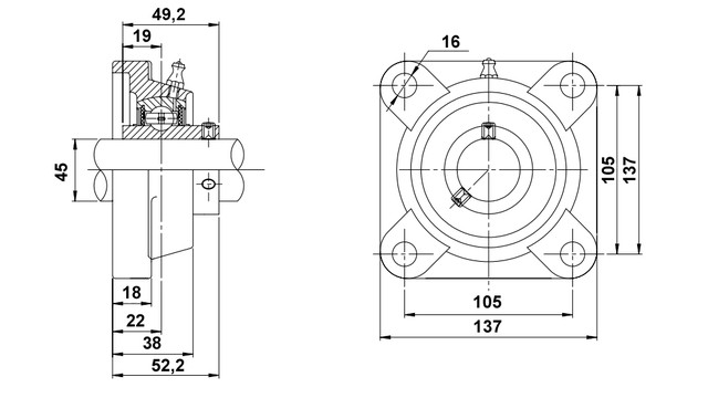 Фланцевий корпусний вузол: кульковий, самоцентруючийся підшипник зі сферичною зовнішньою обоймою в чавунному корпусі